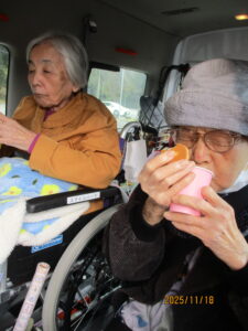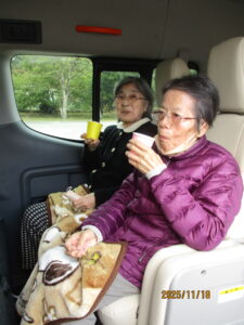 車内ではお茶とお菓子を食べられ、会話も弾むひとときでした。